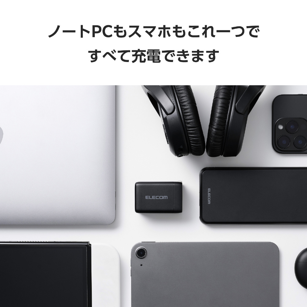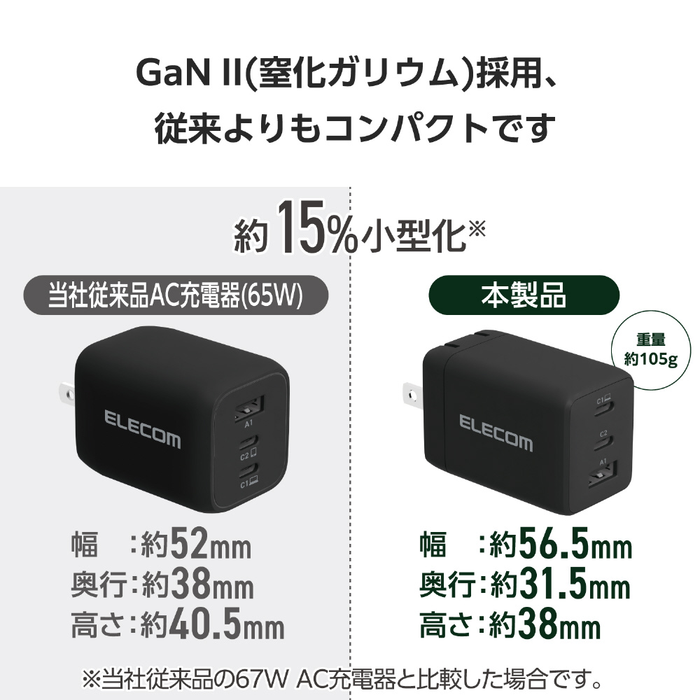 スマホ・ワイヤレスイヤホン・ノートパソコンを3台同時充電OK!コンパクトながらUSB-AとUSB Type-C(TM)、いずれのケーブルも接続できるAC充電器です。USB Power Delivery 67Wの高出力で幅広い機器をしっかり充電できます。