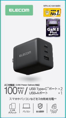 商品名 充電器 PD 100W / PPS対応 高速充電 3ポート ( USB-C ×2 / USB-A ×1 ) GaN II採用 PSE認証 コンパクト 折りたたみ式プラグ 【 MacBook iPhone iPad Galaxy Android 等対応 】 MPA-AC104100BK 【sof001】