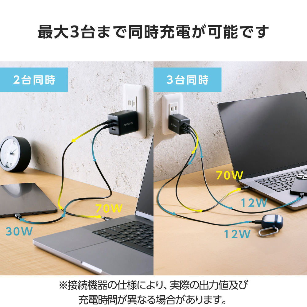 2ポート・3ポート同時接続時は12W〜70Wでの出力が可能。ノートパソコンやスマートフォン、タブレット、ワイヤレスイヤホン、電子タバコなど、幅広いデバイスを同時に充電できます。