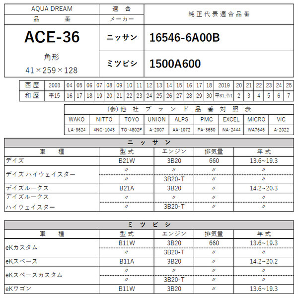 ■互換品番:「WAKO」LA-3624・「NITTO」4NC-1043・「TOYO」TO-4802F・「UNION」A-2007・「ALPS」AA-1072・「PMC」PA-3650・「EXCEL」NA-2444・「MICRO」WA7646・「VIC」A-2022