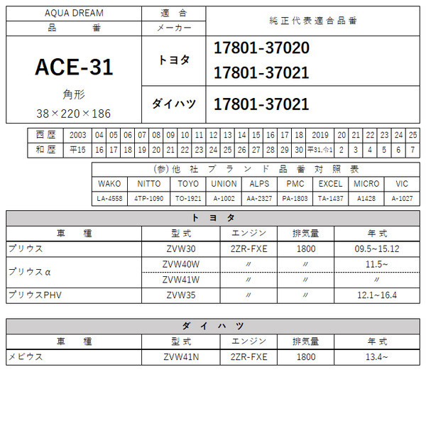 | 商品名 | PLATINUM エアフィルター トヨタ・ダイハツ車用 (純正品番:17801-37021 等) AD-ACE-31 |