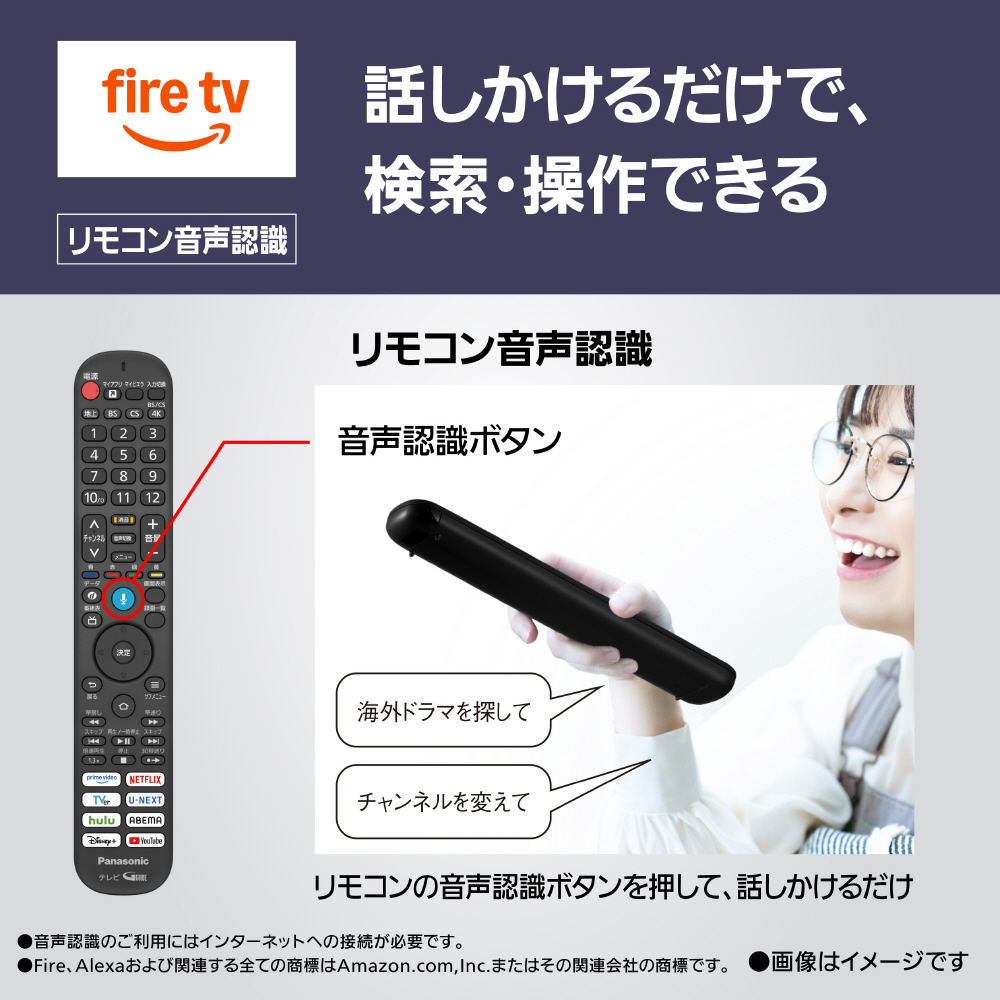 ※●Fire TVに関するご案内:〇Fire TVをご利用いただくには利用規約への同意が必要です。〇サービスや一部機能のご利用にはAmazonアカウントでのサインインが必要です。Amazonアカウントの新規取得にはパソコンやスマートフォンなどの端末とメールアドレスまたはSMSが受信可能な電話番号が必要です。〇サービスによっては、別途登録・契約や料金が必要な場合があります。また、予告なく変更・停止・終了する場合があります。〇Fire OSおよびFire TVの画面等は随時更新されるため、2025年5月現在の情報で記載しております。本サイトに記載のタイトルやメニューは実際と異なる場合があります。〇一部機能の利用には、本機をネットワークに接続しての機器本体のバージョンアップが必要となる場合があります。詳しくはhttps://panasonic.jp/viera/supportをご確認ください。オンラインサービスのご利用には、別途登録・契約や料金が必要な場合があります。また、予告なく変更・停止・終了する場合があります。