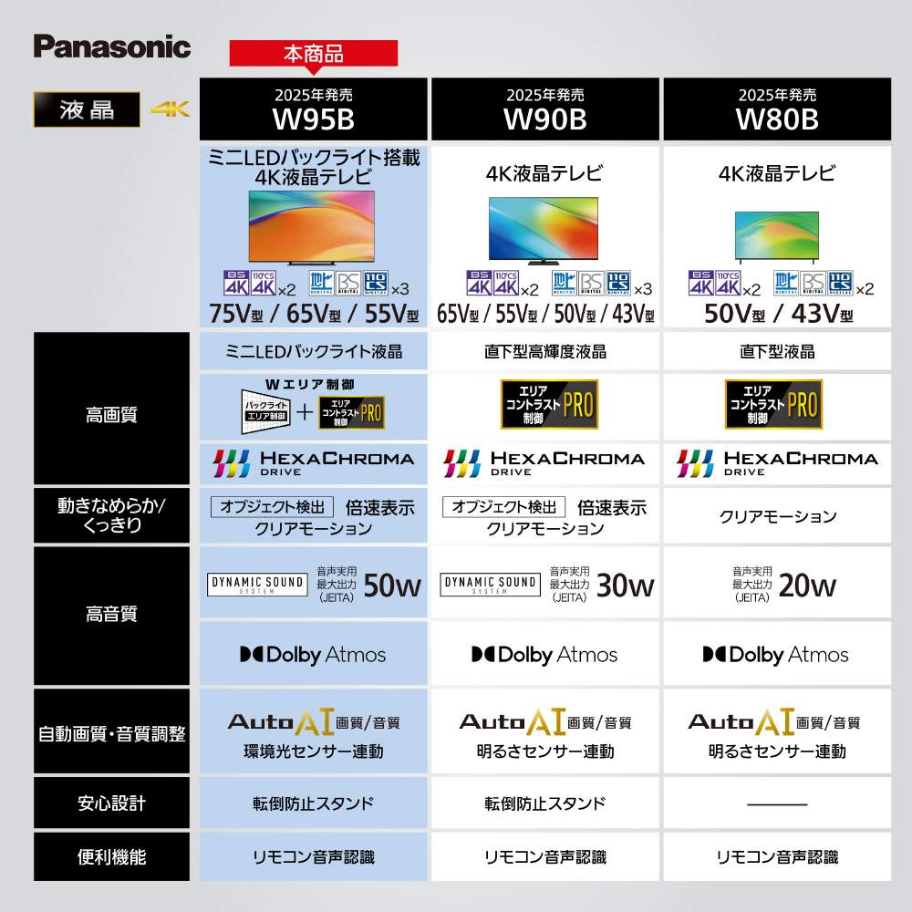 ※●Fire TVに関するご案内:〇Fire TVをご利用いただくには利用規約への同意が必要です。〇サービスや一部機能のご利用にはAmazonアカウントでのサインインが必要です。Amazonアカウントの新規取得にはパソコンやスマートフォンなどの端末とメールアドレスまたはSMSが受信可能な電話番号が必要です。〇サービスによっては、別途登録・契約や料金が必要な場合があります。また、予告なく変更・停止・終了する場合があります。〇Fire OSおよびFire TVの画面等は随時更新されるため、2025年5月現在の情報で記載しております。本サイトに記載のタイトルやメニューは実際と異なる場合があります。〇一部機能の利用には、本機をネットワークに接続しての機器本体のバージョンアップが必要となる場合があります。詳しくはhttps://panasonic.jp/viera/supportをご確認ください。オンラインサービスのご利用には、別途登録・契約や料金が必要な場合があります。また、予告なく変更・停止・終了する場合があります。