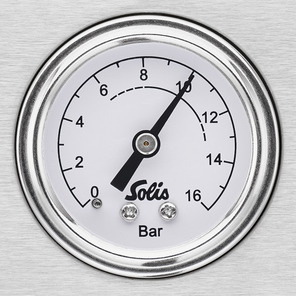 エスプレッソ抽出時の圧力が一目でわかる。エスプレッソ抽出の最適な圧力は8〜12バール。マノメーターで圧力を確認しながら粉分量や粒度を調整。
