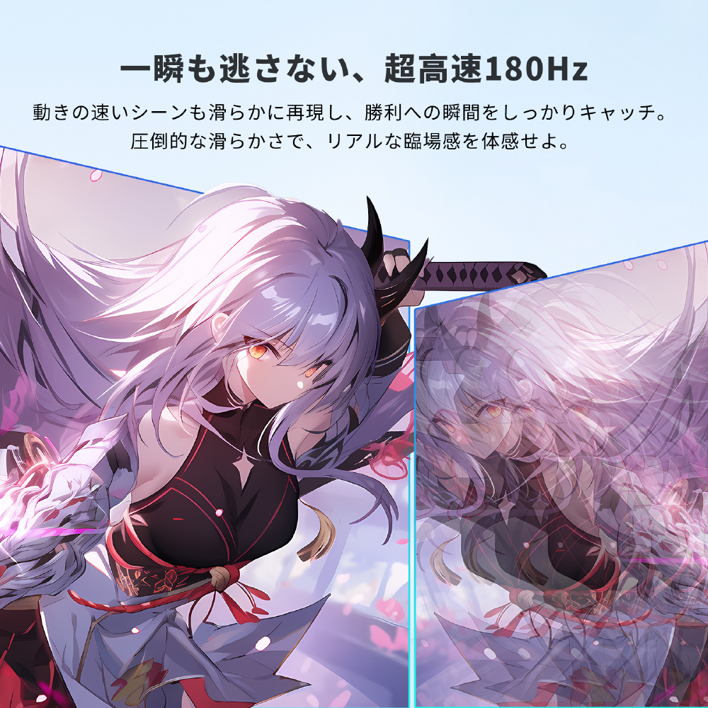 応答速度約1ms(MPRT)、リフレッシュレート最大180Hzの高速表示性能。