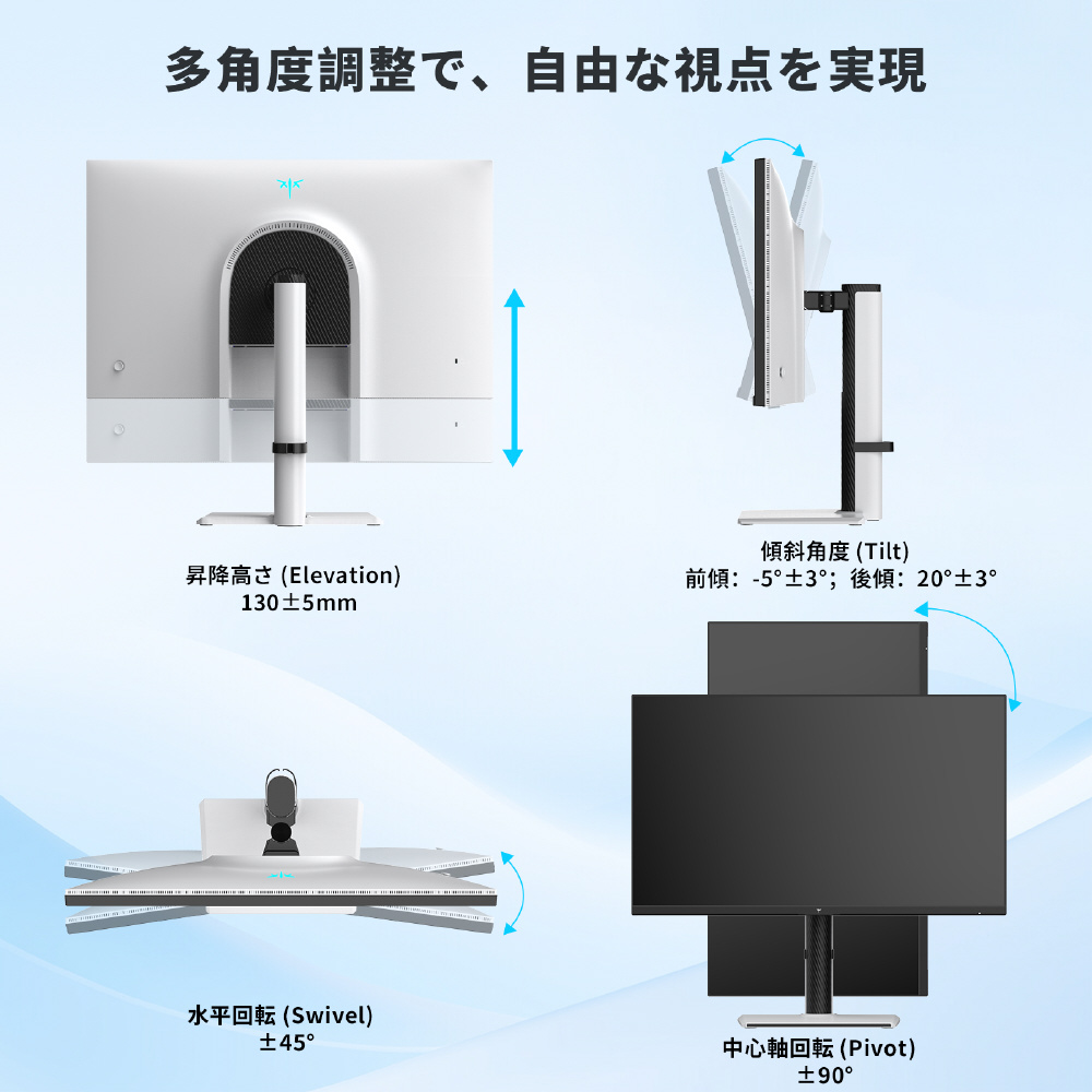 | 高さ調節機能 | [チルト機能]-5°-20°±3° [スイベル]±45° [ピボット]-90〜90° [高さ調節]130mm [クイックリリース]対応 |