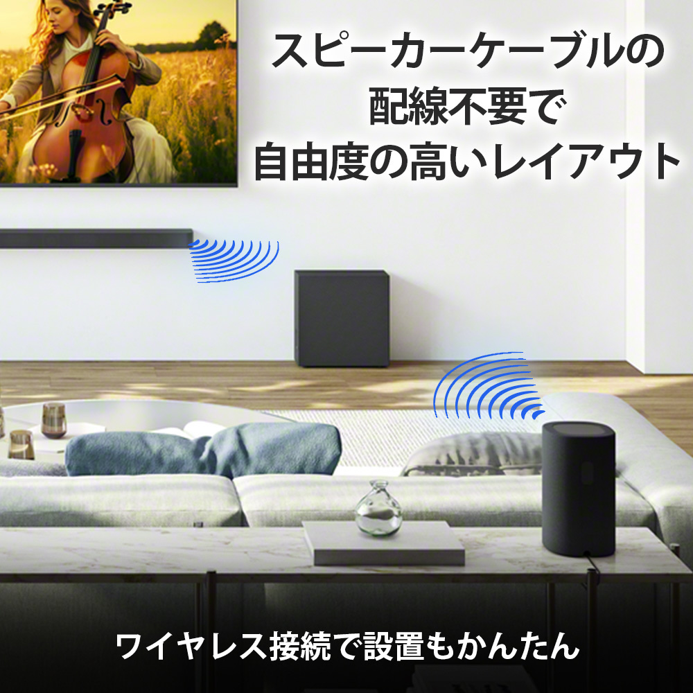 スピーカーケーブルの配線が不要なワイヤレス接続を採用しています。これによりリアスピーカーに電源コードを接続するだけで、サラウンドシステムをすっきりと構築することが可能です。