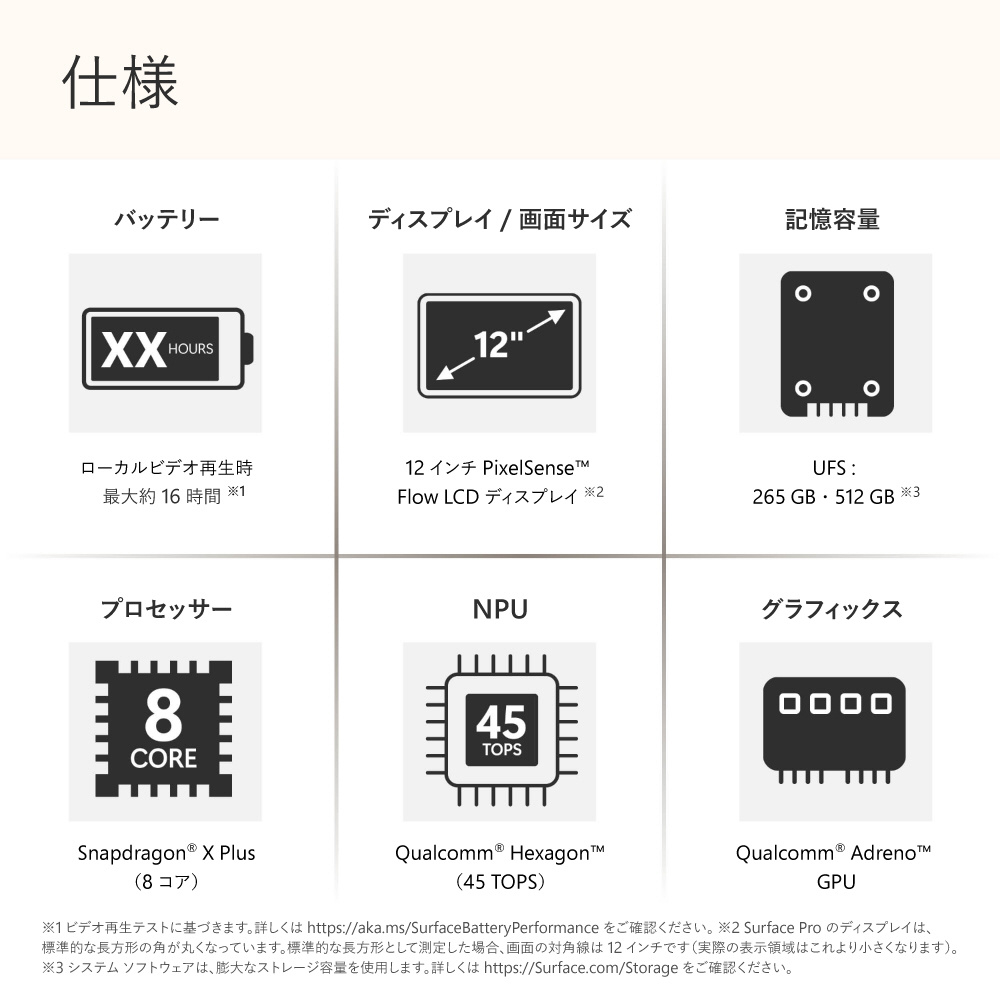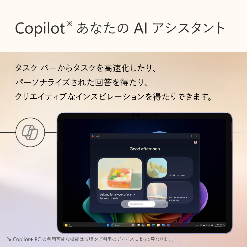 超軽量で柔軟性の高い 2-in-1 Copilot+ PC は、多機能性と携帯性に優れております。タッチ、音声、スリム ペン、および Surface Pro 12 インチ キーボード で簡単に使えるように設計されています。