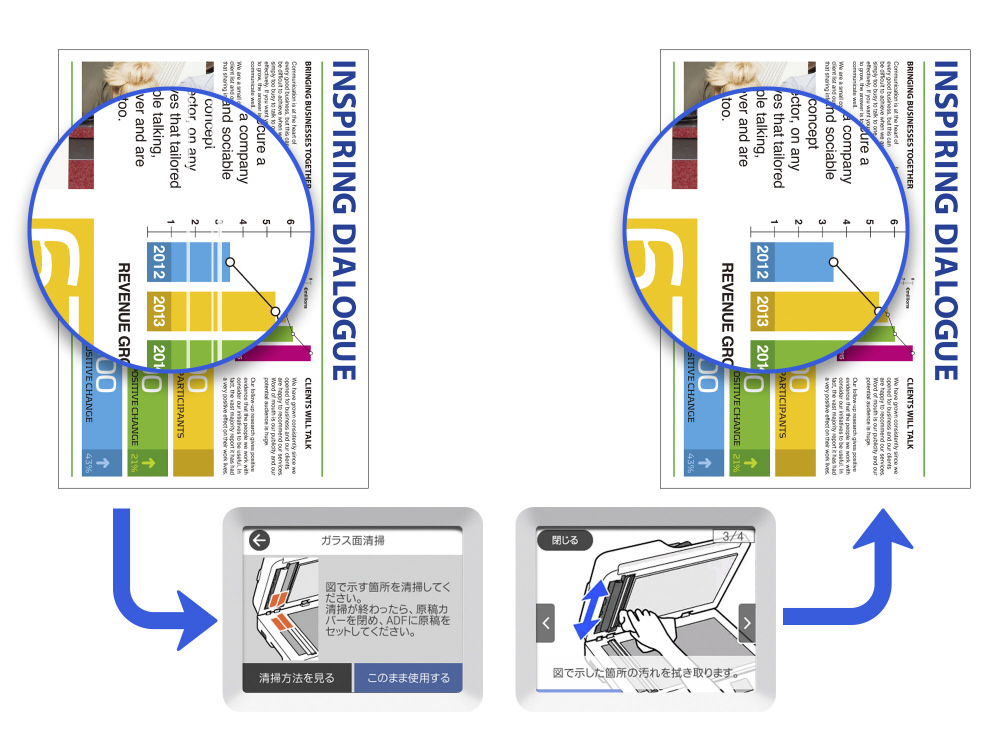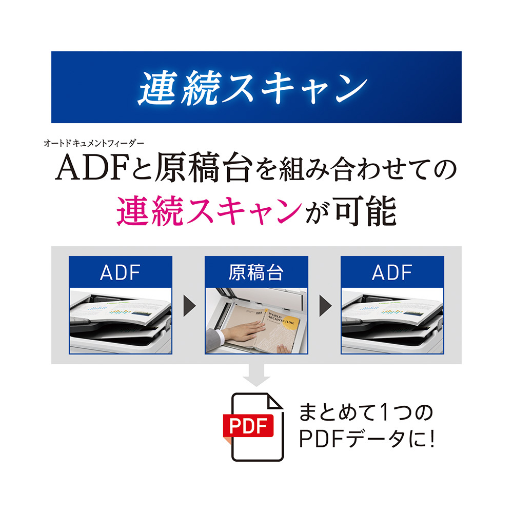 有線LAN&無線LAN対応で複数のPCでスキャナーを共有利用したり、スマートデバイスからも直接スキャンしたりできます。また、ネットワークを介して指定した宛先にダイレクトにデータ送信・保存できるPCレス機能も搭載しています。