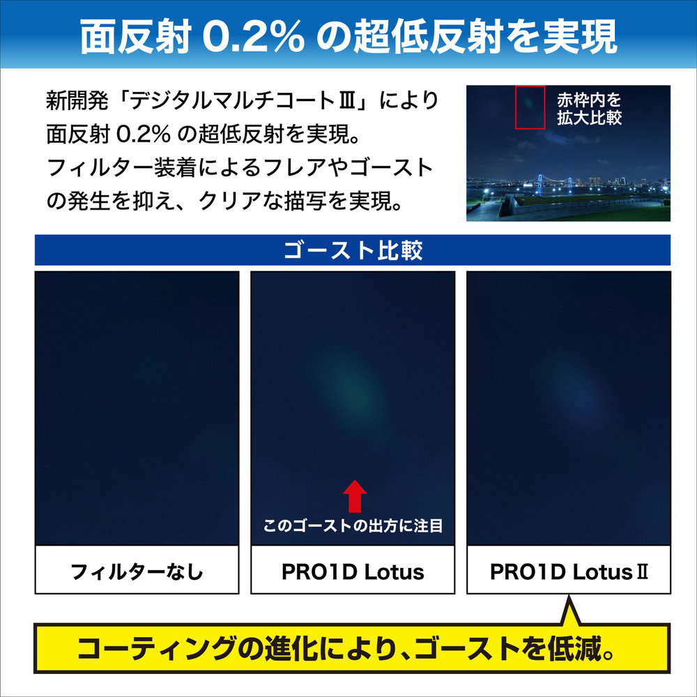 「デジタルマルチコートIII」により面反射0.2%の超低反射を実現。フィルター装着によるフレアやゴーストの発生を抑え、クリアな描写を実現。