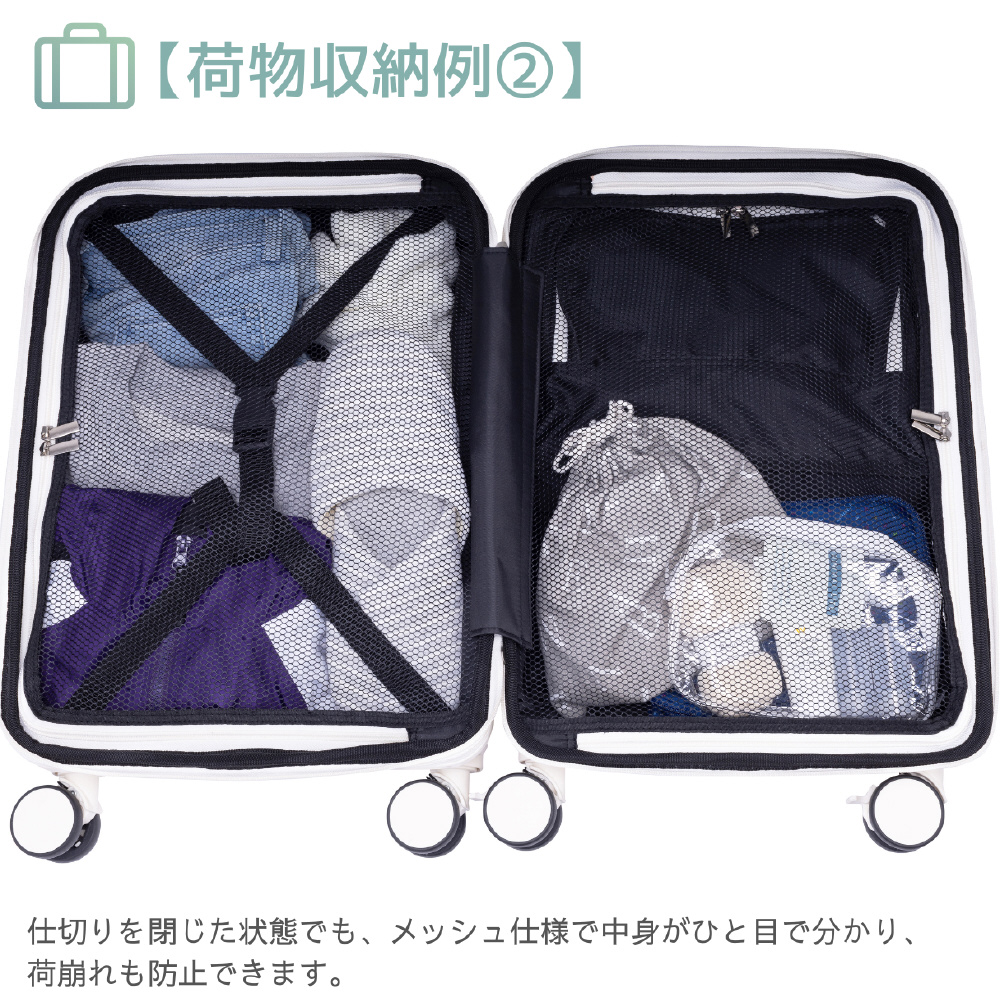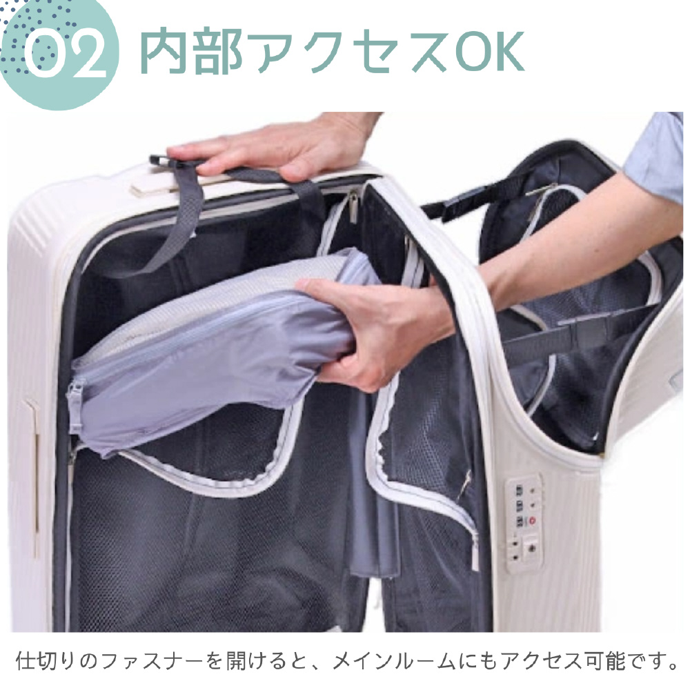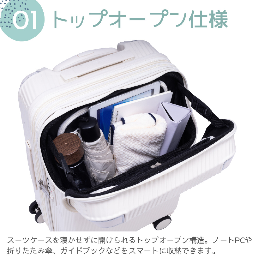 スーツケースを寝かせずに開けられるトップオープン構造。ノートPCや折りたたみ傘、ガイドブックなどをスマートに収納できます。トップからメイン収納へのアクセスも可能。