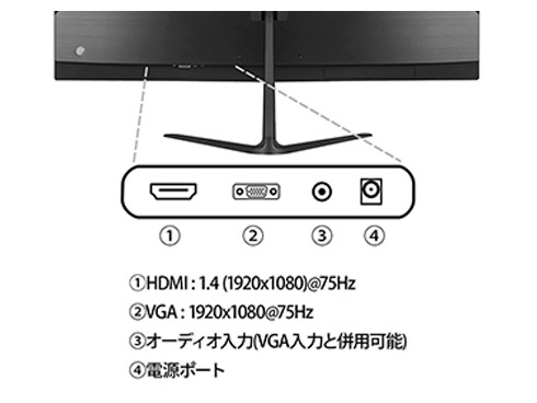 ■インターフェイスは、HDMI 1.4 x1(75Hz)、VGA x1(75Hz)を搭載します。VGA端子を搭載していますので以前から使用しているPCなどとの接続も可能です。