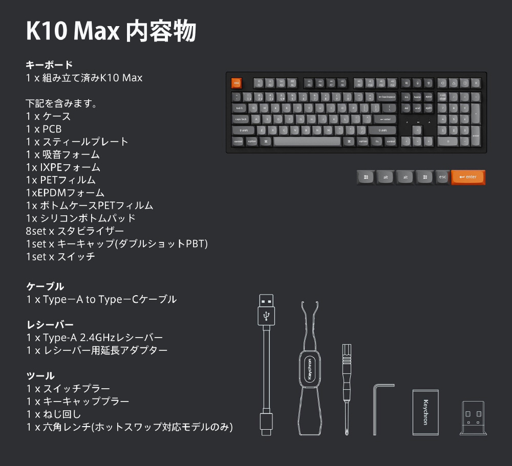 Keychron K10 Maxは、100%レイアウトのワイヤレスメカニカルキーボードです。2.4GHz、Bluetooth、有線接続に対応しており、QMKやKeychron Launcherのウェブアプリを通じてカスタマイズ可能です。
