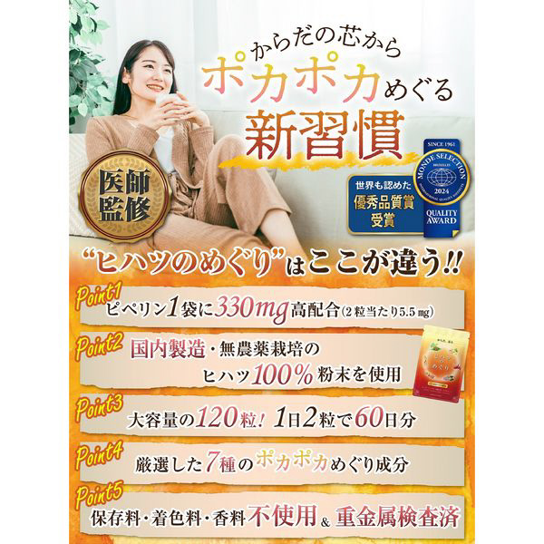 内容量:30g( 250mg×120粒 約1〜2ヶ月分) 2粒に含まれるピペリンは5.5mg 1日2〜4粒(約5.5〜11mg)を目安にお召し上がりください。