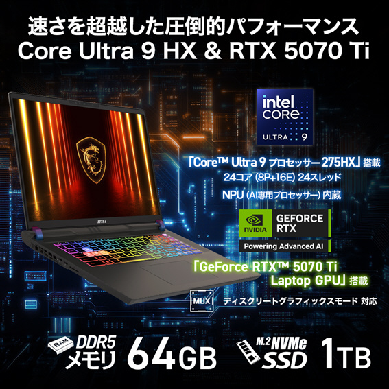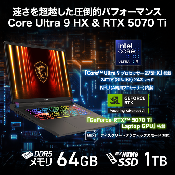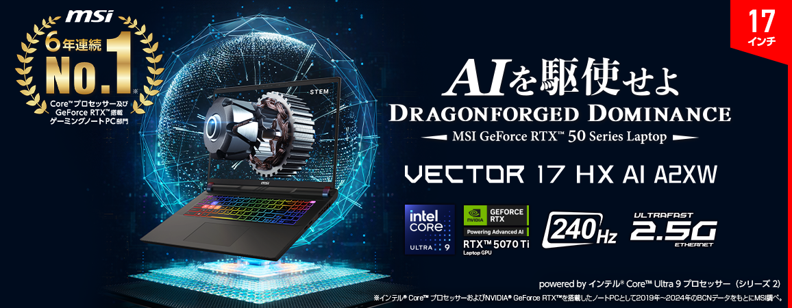 商品名 | ゲーミングノートパソコン Vector 17 HX AI A2XW(RTX 5070 Ti ) コスモスグレイ Vector-17-HX-AI-A2XWHG-6359JP [17.0型 /Windows11 Pro /intel Core Ultra 9 /メモリ:64GB /SSD:1TB /2025年4月モデル] 【sof001】 |