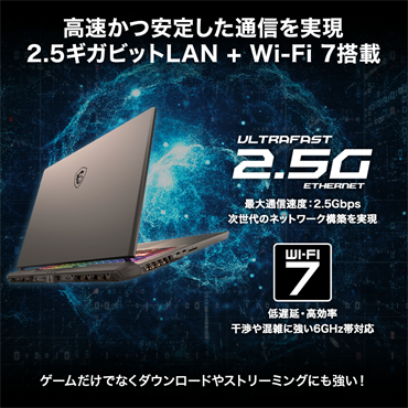 2.5Gbps対応の超高速有線LANに加え、干渉・混雑に強く、有線レベルの通信速度と安定性を実現する次世代無線LAN「Wi-Fi 7」を標準搭載。