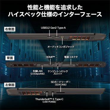 インターフェイス | 有線LAN 2.5Gbps ×1 SDカードリーダー(SDXC対応) ×1 Thunderbolt 5 Type-C(USB PD**対応)×2 USB3.2 Gen2 Type-A ×2 HDMI ×1 オーディオコンボジャック ×1 |