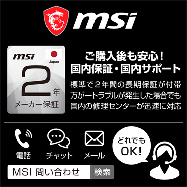 標準で2年間の長期保証が付帯。万が一トラブルが発生した場合でも、日本国内のコールセンター・修理センターが迅速に対応。MSIはサポート体制も充実。