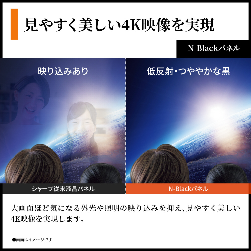 ・量子ドットにより純度の高い3原色を生み出すことで、多彩な色を正確かつ鮮やかに映し出します。加えて、外光や照明の映り込みを抑えながら、艶やかな黒を実現する「N-Blackパネル」を搭載。