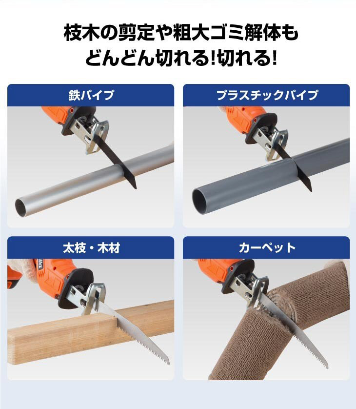 ●枝切り、切断、解体など、様々な作業をこれ1台でスピーディーにこなせるハイパワー電動ノコギリです。