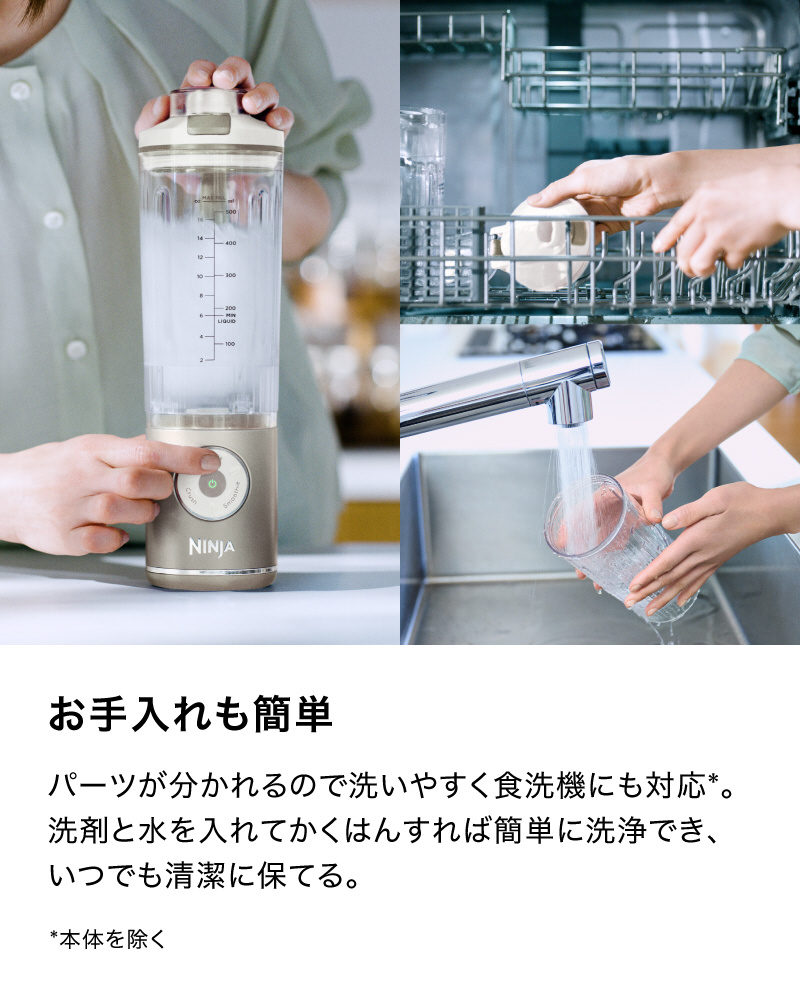 使用後は洗剤と水をいれてかくはんするだけで洗浄完了。パーツは取り外せて、ボトルとフタは食器洗い機にも対応でお手入れが簡単