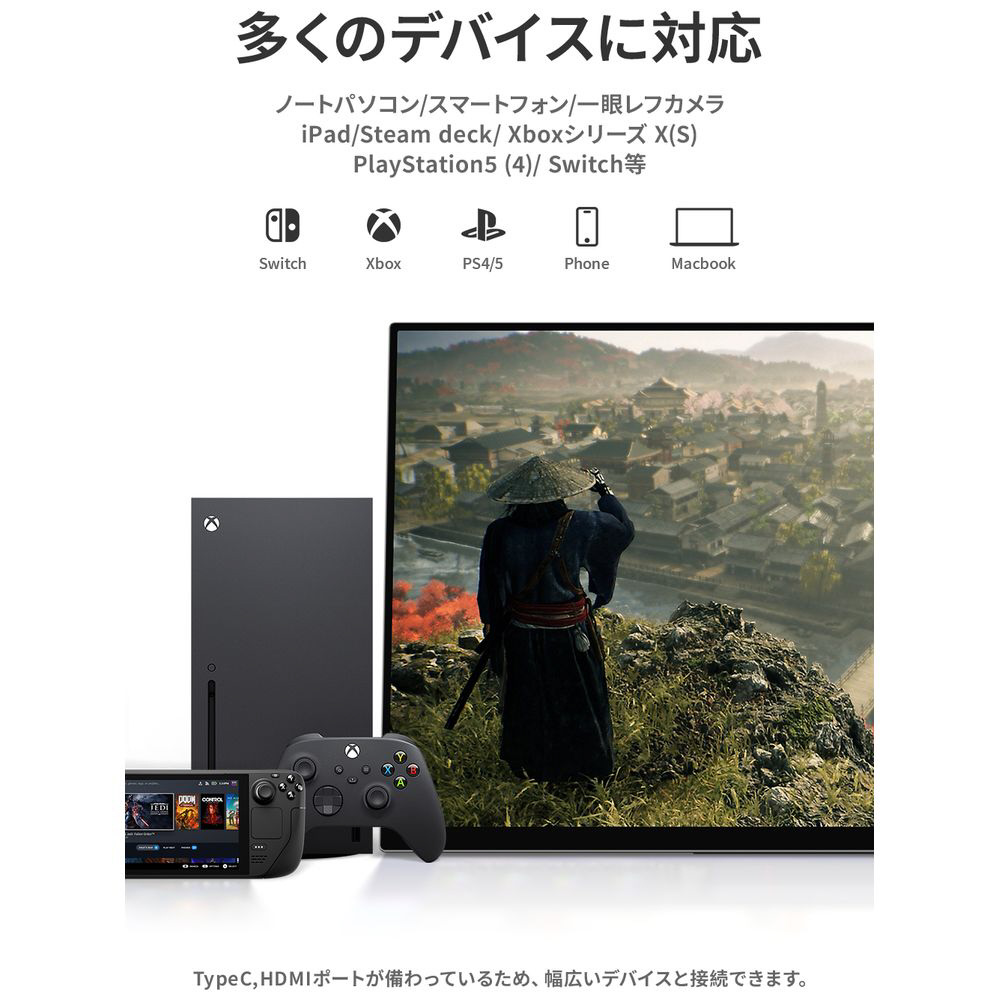 折りたたみ可能な入出力ポート付スタンドが本体と直結しております。締め付けすぎず、緩すぎない絶妙な取り付けにより、角度調整もスムーズに行えてラクラク設置できます。内側に接続ポートがある設計のため、ケーブルもすっきりと収納可能で縦置きも対応。Alt mode(Thunderbird3規格)に対応したデバイスにはType-Cケーブル1本で電源給電・映像出力が可能です。本機種はWindowsOS対応パソコン、MacBook Pro/MacBook Air等Mac製品、スマホではiPhone/Android各機種、その他PS4/PS5/Xbox/Nintendo Switch、Raspberry Pi等あらゆるデバイスに対応しており、ゲームモニターとしてもご活用いただけます。