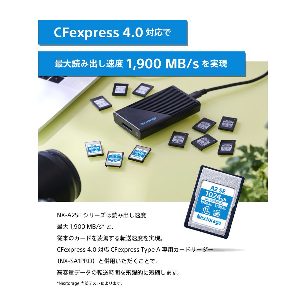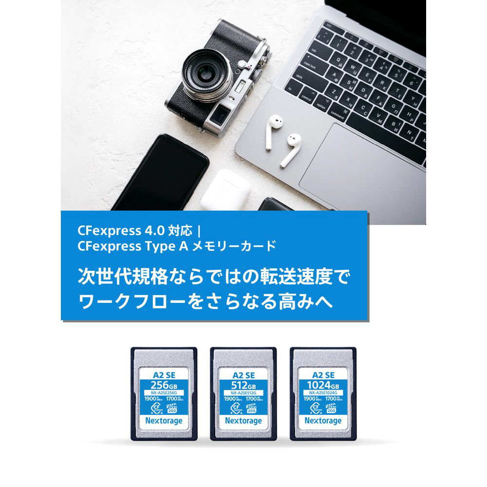 Nextorage NX-A2SEシリーズは、VPG200対応のCFexpress4.0 Type Aメモリーカードです。 VPG対応を必要とするSony製カメラで安心してお使いいただけます。