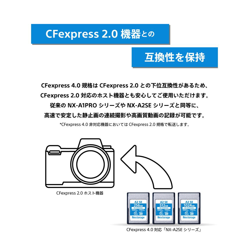 (*CFexpress 4.0非対応機器においてはCFexpress 2.0規格で転送します。現行のカメラでは従来のCFexpress 2.0規格と下位互換性があり、安定した高画質動画撮影や高速連写撮影が可能です。)
