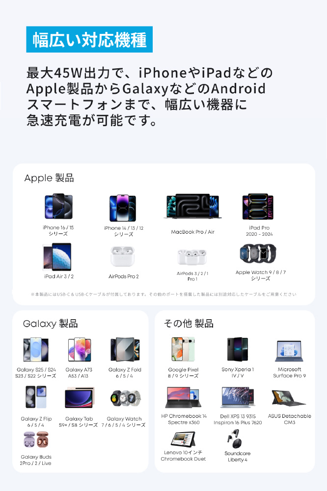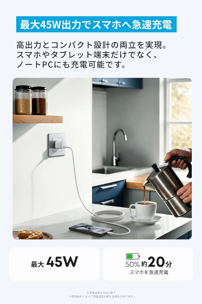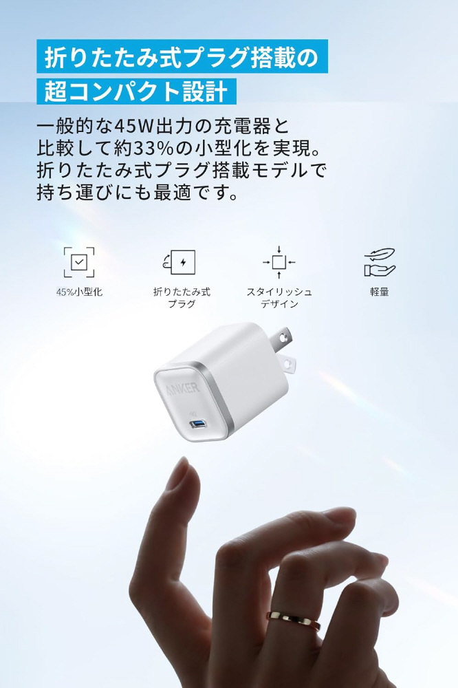 45W出力でコンパクトなケーブル同梱USB急速充電器