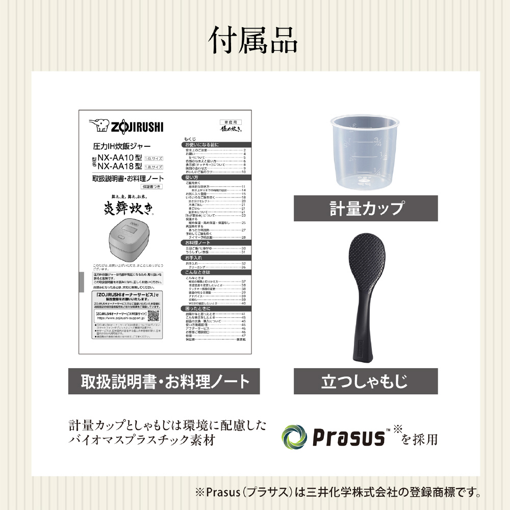 | 付属品 | 立つしゃもじ(Ag+抗菌加工)・白米用計量カップ(約180mL = 約1合)・取扱説明書(お料理ノート・保証書) |