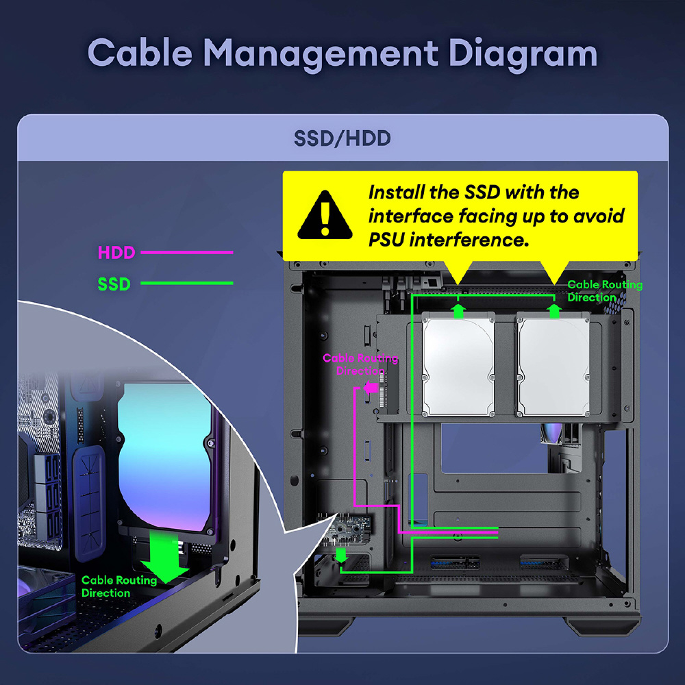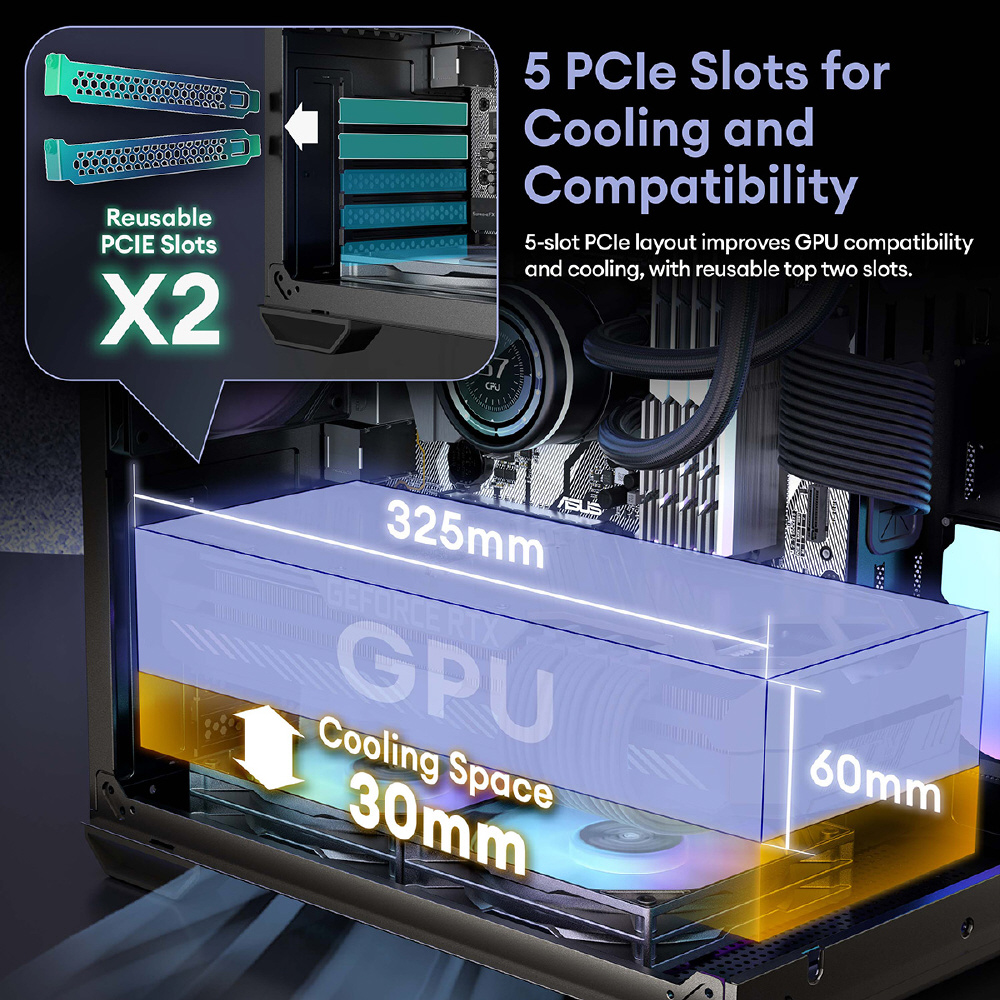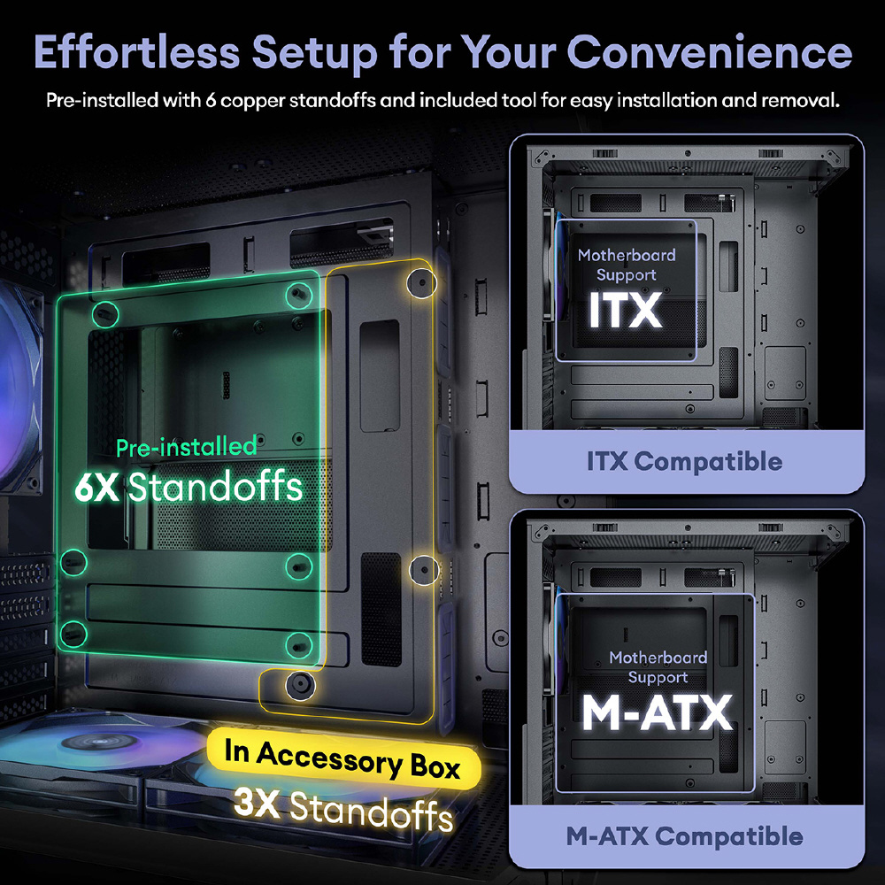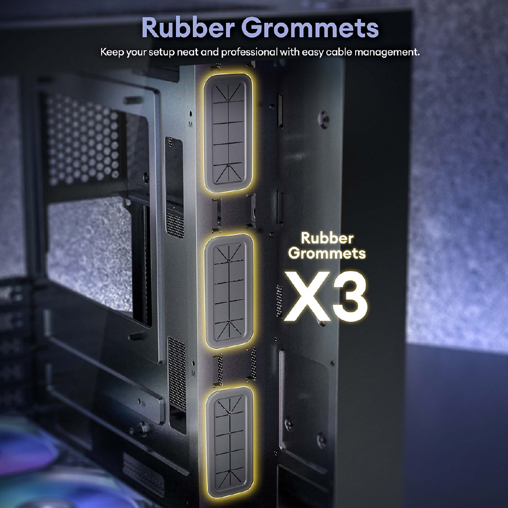 Mirage(ミラージュ) 4は、 ARGBファン3個を標準搭載したピラーレスのMicro-ATX対応PCケースです。ピラーレスで開放感のある270度のパノラマビューを活用でき、最大95 mm幅の広大な裏配線スペースを確保しています。トップは最大で240 mmまでのラジエータ搭載に対応し、トップとボトムに2つのダストフィルターを搭載。