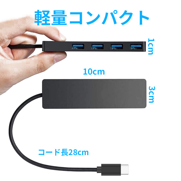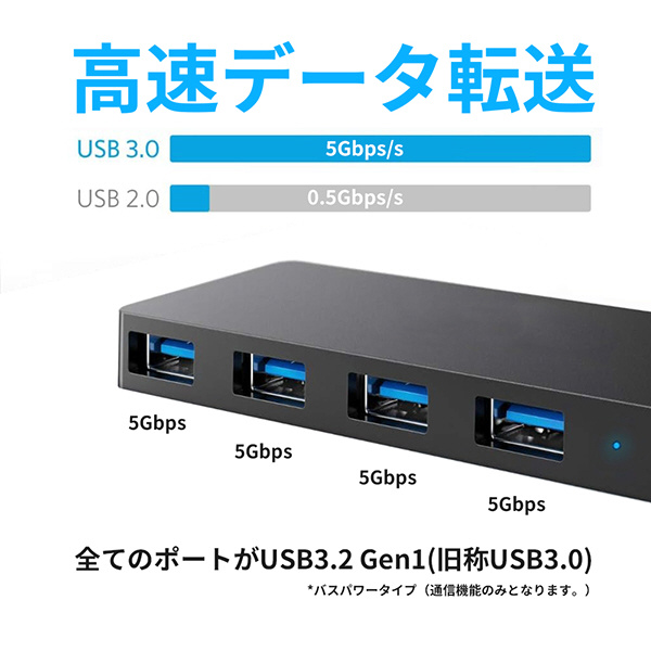 UBS3.2 Gen1(旧称USB3.0) のバスパワータイプのType-C →Type-A 4ポート5Gbps対応HUBです。4ポート全てが5Gbpsの高速通信可能です。