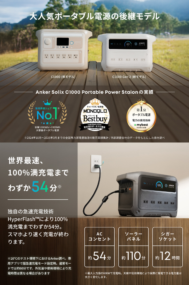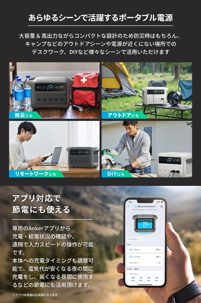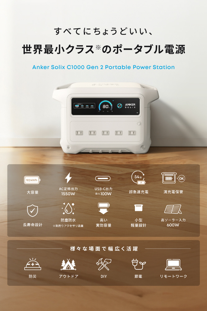 1000Wh以上の大容量は変わらずに、前モデル (Anker Solix C1000 Portable Power Station) から約7%の省サイズ化と約12%の軽量化を実現した世界最小クラスのポータブル電源です。