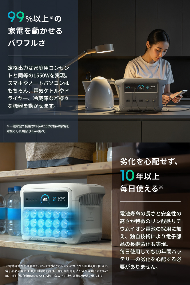 定格出力は家庭用コンセントと同等の1550Wを実現。スマホやノートパソコンはもちろん、電気ケトルやドライヤー、冷蔵庫など様々な機器を動かせます。