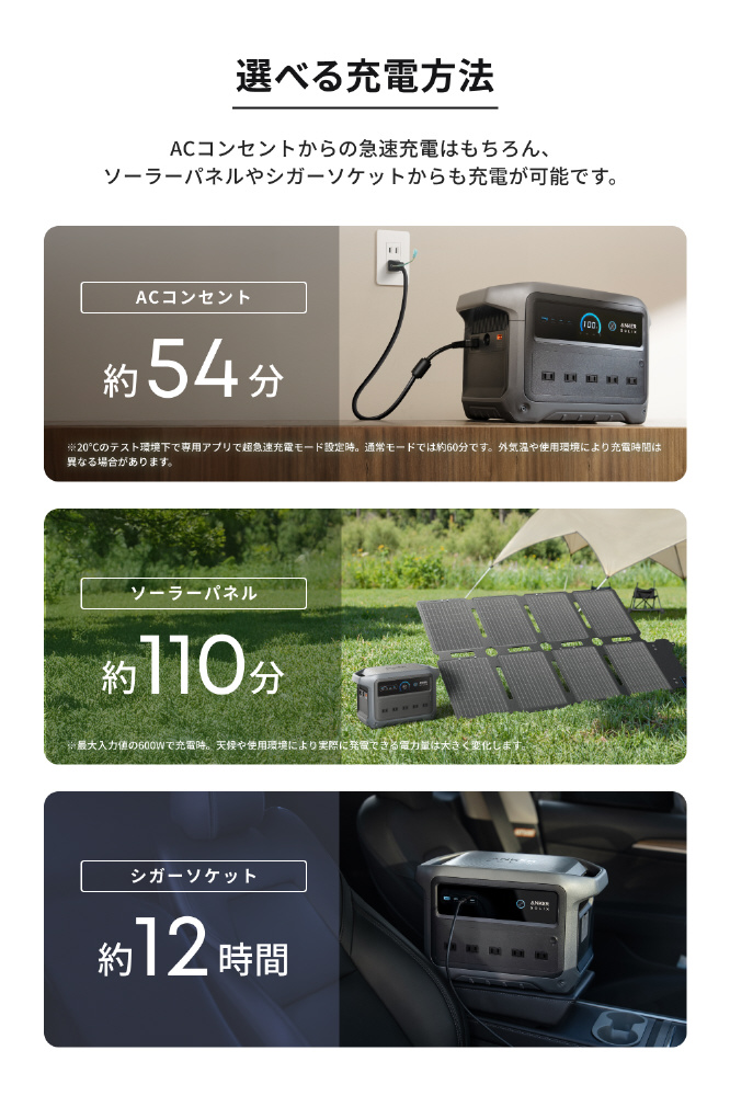 ACコンセントからの急速充電はもちろん、ソーラーパネルやシガーソケットからも充電が可能です。ソーラーパネルからは最短約1.4時間、シガーソケットからは最短約12時間で充電頂けます。