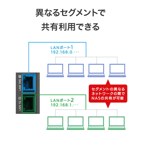 「NICチーミング」機能を利用すれば、本商品の複数のLANポートを束ね、トラフィックの負荷分散や冗長化を実現できます。