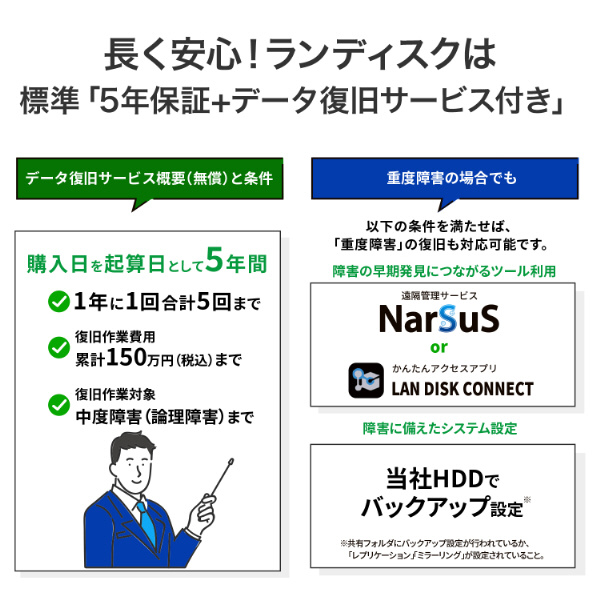 ■長く安心!ランディスクは標準「5年保証+データ復旧サービス付き」