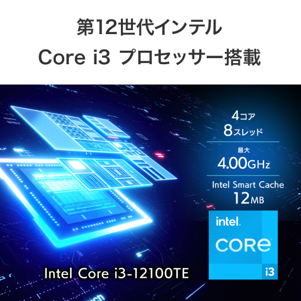 第12世代インテル Core i3 プロセッサー(最大4.00GHz Quad Core)を搭載。