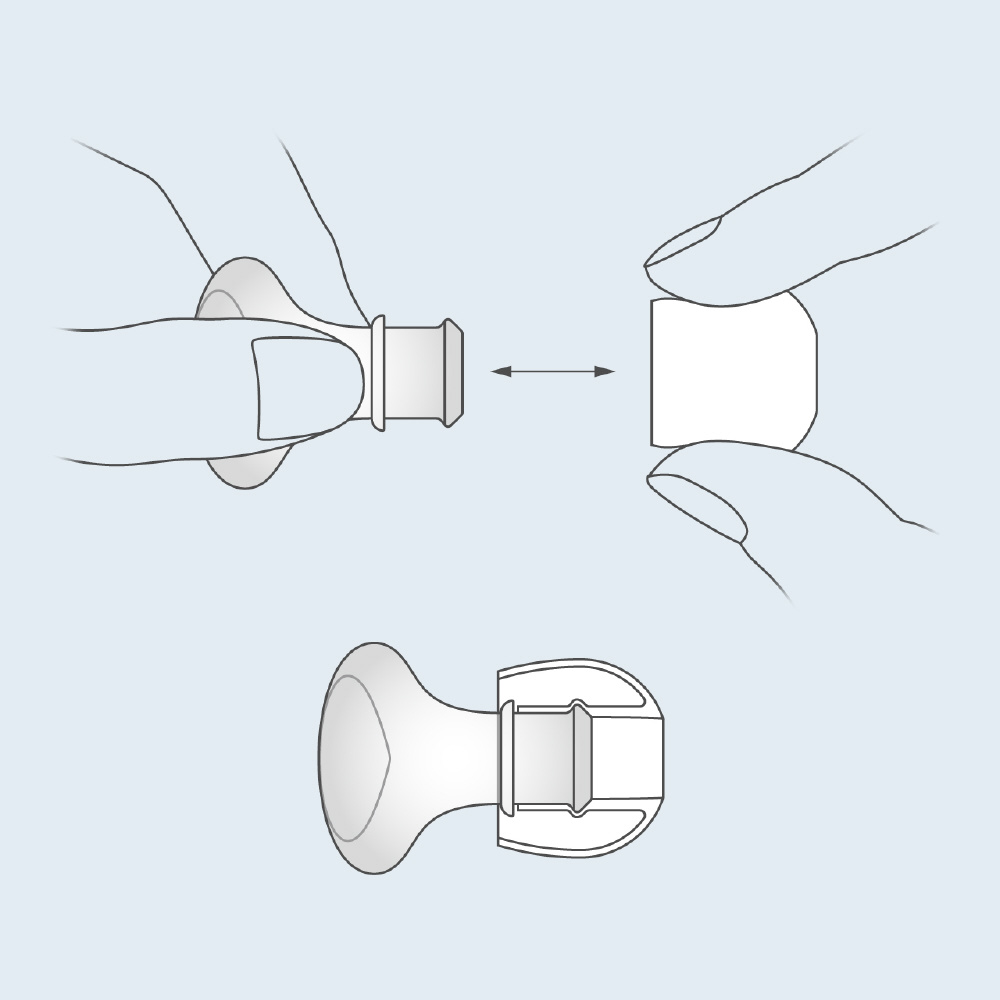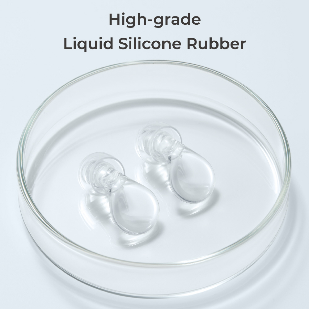 イヤープラグ着用中の肌への負担を軽減し、ストレスフリーな装着感を実現するため、日本を代表する化学メーカー製のLSR(Liquid Silicone Rubber)を採用。LSRは優れた物性と非毒性を兼ね備えた無臭の液状シリコーンゴムです。一般的なシリコンや熱可塑性エラストマー(TPE)と比較して、極めて柔軟性が高いため、引き裂きに強く、圧縮永久歪み(圧縮変形に対するへたり性)が低く、摩耗や損傷に対する耐久性にも優れています。さらに、FDA(アメリカ)およびLFGB(ドイツ)が定める医療機器や食品などの安全基準に準拠した生体適合性の高いメディカルグレードの安全性(※)を備えており、デリケートな肌質の方でも安心してご使用いただけます。