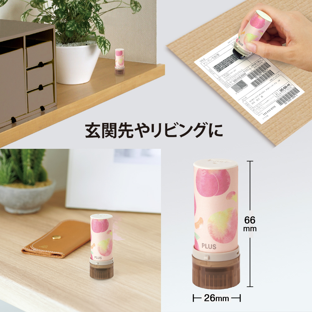 スリムで握りやすい、新ソフト印面が捺印対象にフィットしてかすれにくい。玄関棚やインテリアになじむカラーとフルーツ柄を採用。