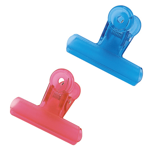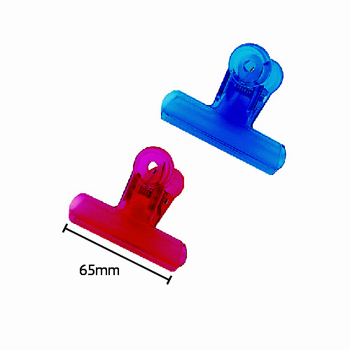 ●寸法:挟み口65mm●材質:ABS樹脂,ステンレスバネ●包装:フックの出きるスライドパック●入数:2本●色:スケルトン調レッド,ブルー