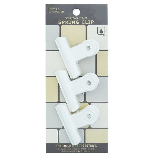 ●寸法:挟み口50mm●材質:ABS樹脂,ステンレスバネ●包装:フックの出きるスライドパック●入数:3本●色:ホワイト