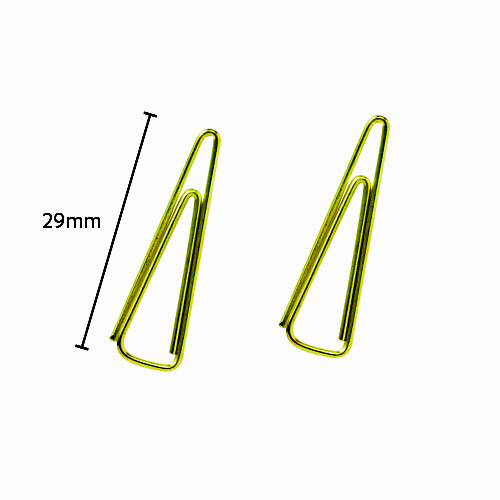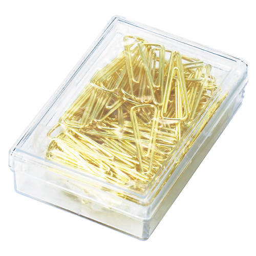 さしやすい三角形のゼムクリップ(ゴールドカラー)。約90本入り。全長29ミリ。