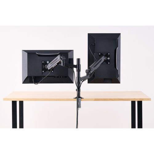 モニターの位置を自由に調節でき、デスクのスペースを有効活用!40インチまでのモニターに対応する、ロングアームのメカニカルスプリング式ダブルモニターアームです。モニターからのケーブルをすっきりまとめることができる、ケーブルホルダー付きです。