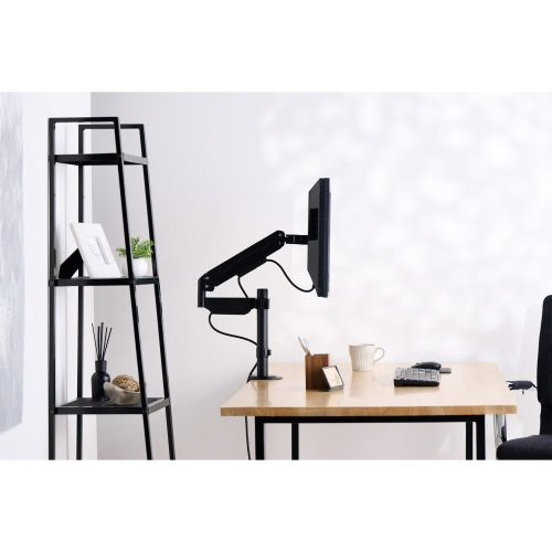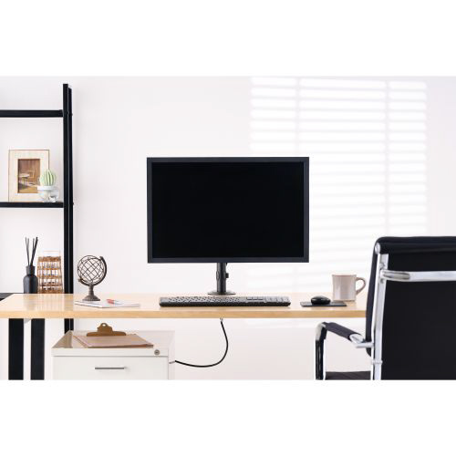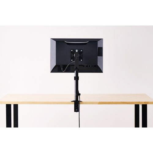 モニターの位置を自由に調節でき、デスクのスペースを有効活用!17〜32インチまでのモニターに対応する、支柱付きのガススプリング式のシングルモニターアームです。モニターからのケーブルをすっきりまとめることができる、ケーブルホルダー付きです。