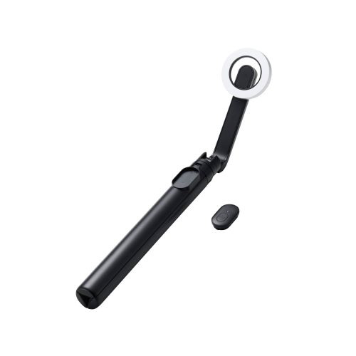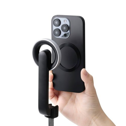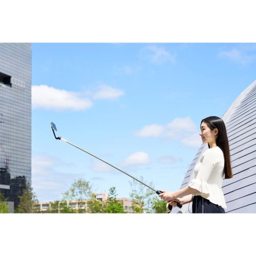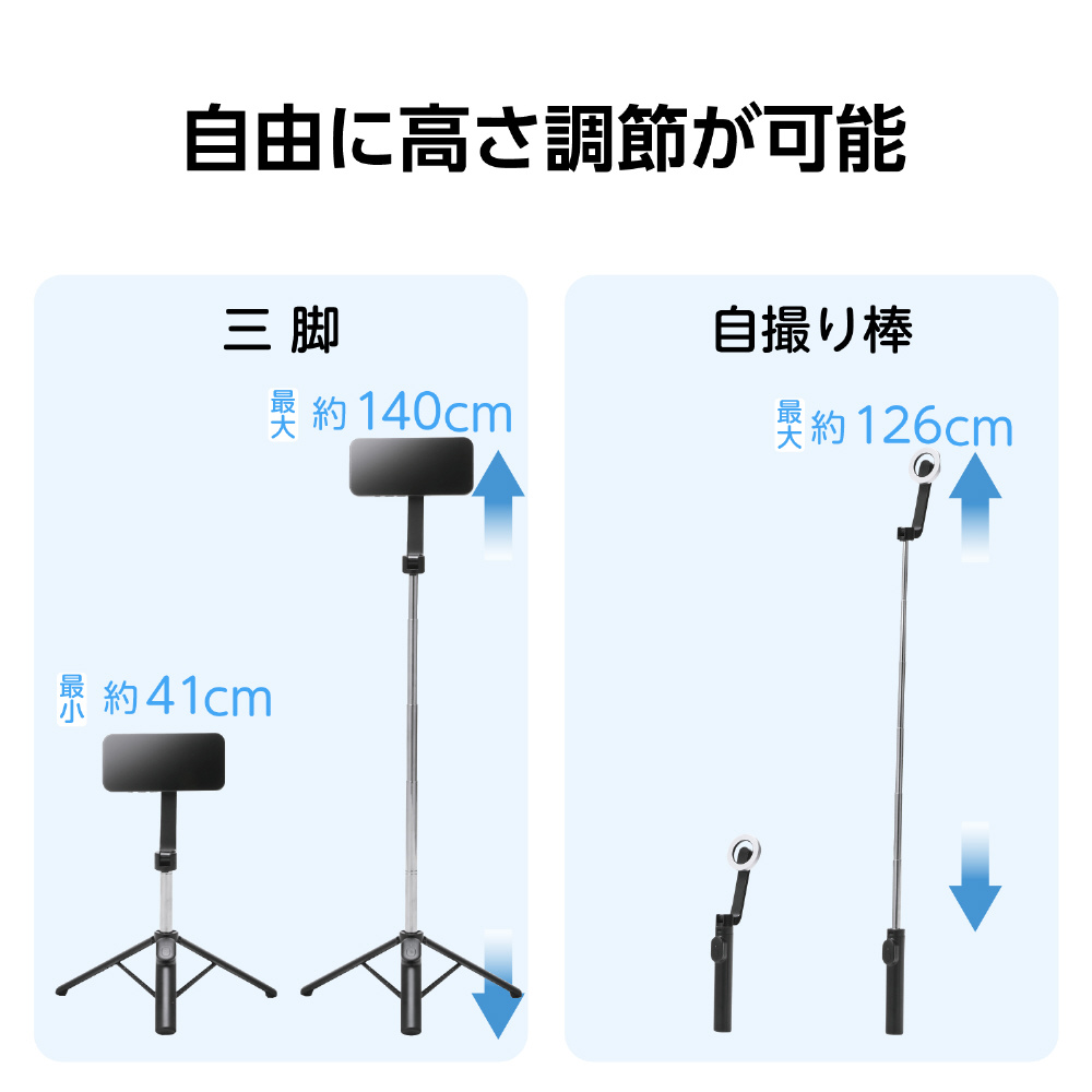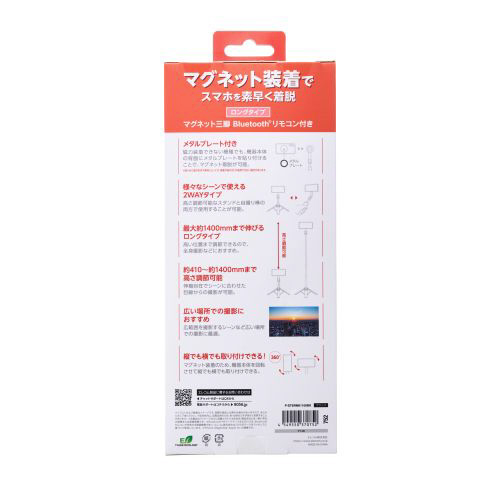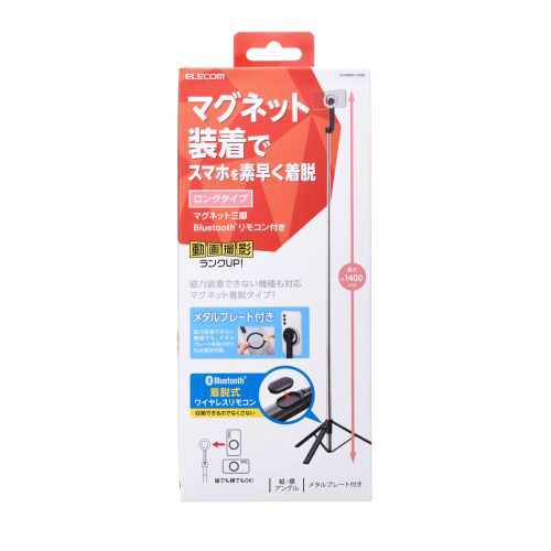 広い場所での撮影や全身撮影におすすめ。自撮り棒としても使える2Way設計で、最大約1400mmまで伸びるロングタイプのスマートフォン用三脚です。マグネット式で着脱も簡単。Bluetooth(R)接続で離れた場所からスマホカメラのシャッターを切れるワイヤレスリモコンが付いています。