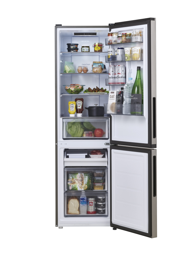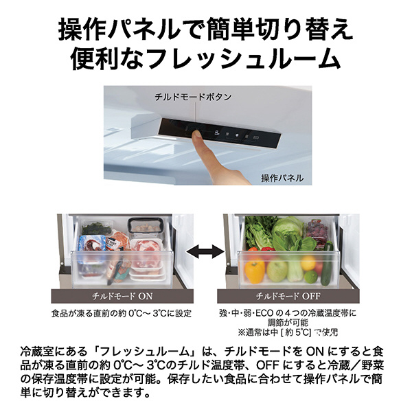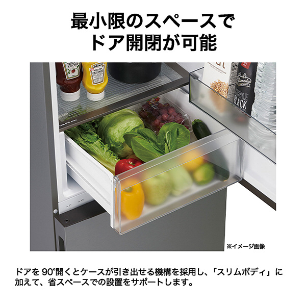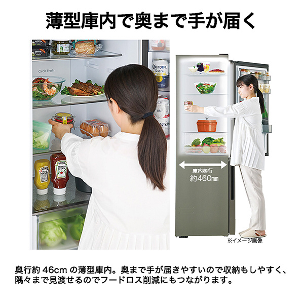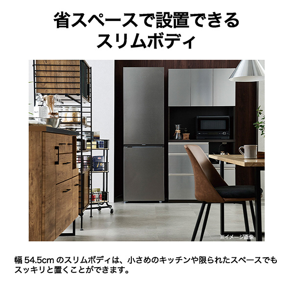 幅54.5cmのスリムボディだから、キッチンや限られたスペースでもスッキリと置くことができます。奥行約46cmの薄型庫内。奥まで手が届きやすいので収納しやすく見渡しやすい。