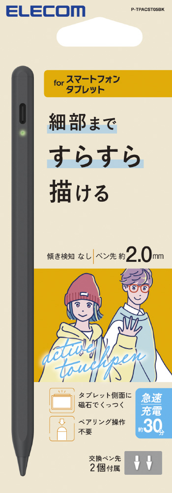 隙間時間の充電ですぐに使える!約30分でフル充電可能な急速充電機能を搭載した、汎用アクティブタッチペンです。約2.0mmのペン先で細かい作業、メモや絵を描くのにおすすめ。ペン先は導電性に優れたポリアセタール樹脂(POM)を採用し、滑らかな描き心地で画面を傷つけにくいです。