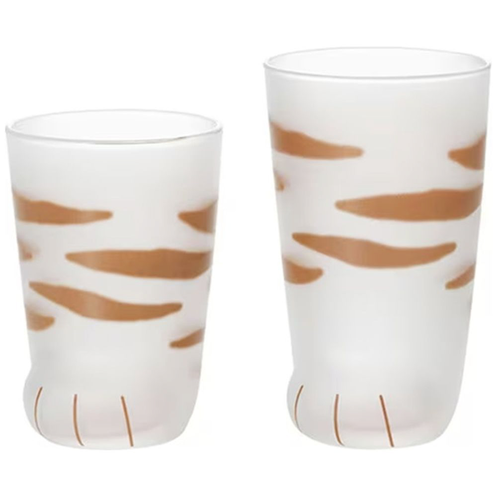 磨りガラスで猫のふわふわした毛並みを表現したグラスの底に、ピンクの肉球が描かれています。