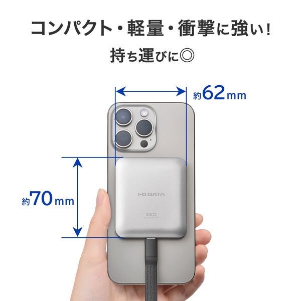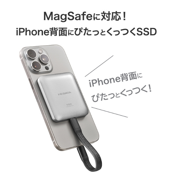 本商品は、USB 20Gbps(USB 3.2 Gen2x2)対応のポータブルSSDです。MagSafeに対応しているため、iPhoneの背面にぴたっとくっつきます。